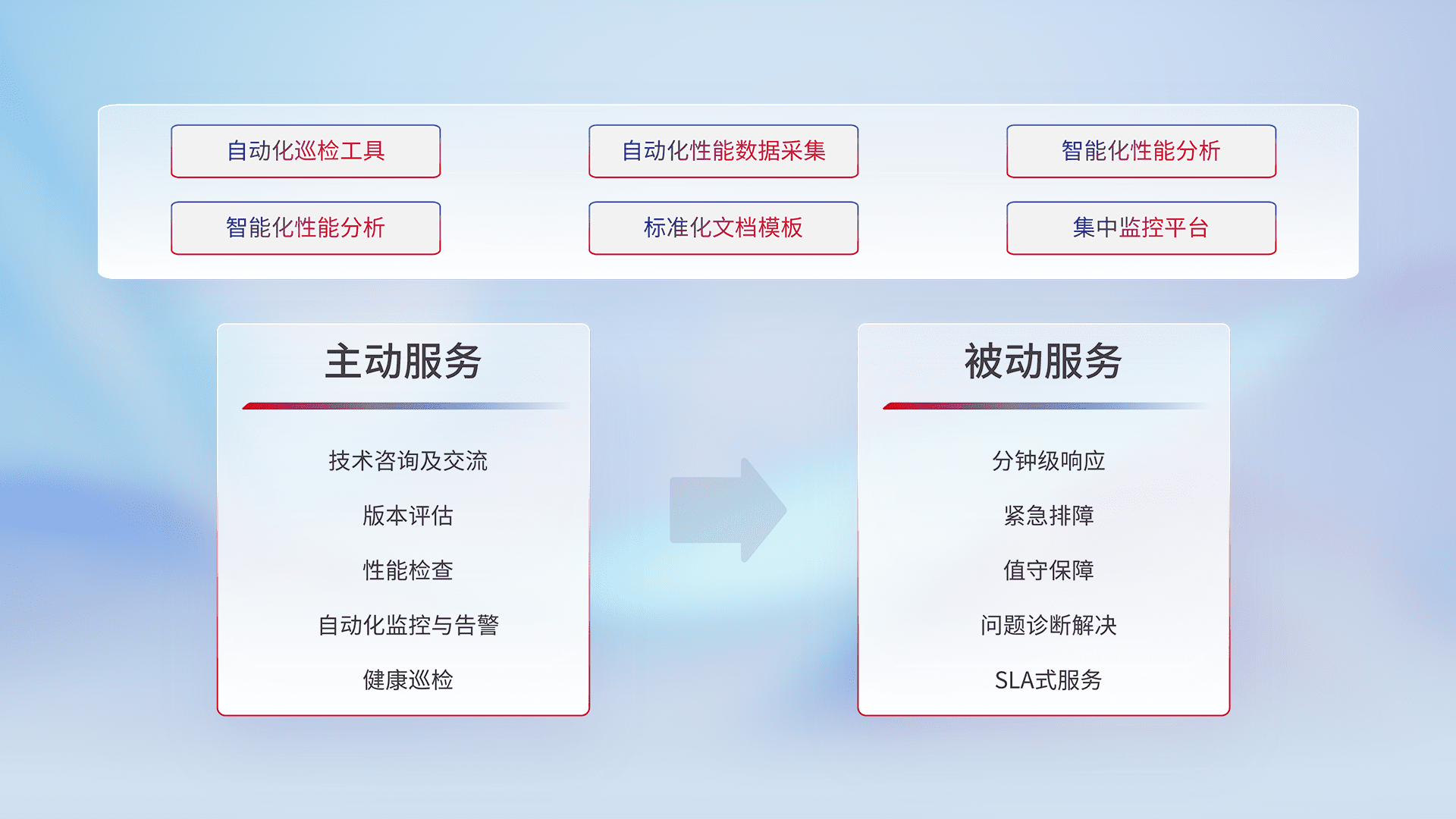 智能化工具和标准化文档,,,保障服务质量,,提供主动服务(包含技术咨询、、版本评估、、性能检查、、、自动化监控与告警、、、健康巡检)和被动服务包含(分钟级响应、、、紧急排障、、值守保障、、、问题诊断解决、、SLA服务)。。。。